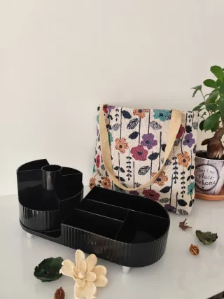 El pack incluye un organizador de maquillaje giratorio color negro, diseño moderno y elegante con varios compartimentos. La sección circular perfecta para brochas, mascara de pestañas o labiales y la bandeja lateral para bases paletas, perfumes, cremas. También queda genial como organizador de escritorio. Este pack es ideal como regalo de cumpleaños, san valentin. El tote bag floral en poliéster muy alegre para primavera, verano, ligero para llevar al hombro, con cremallera, ideal para tus compras, libros o bolso de diario. Estado nuevo a estrenar, Embalaje muy cuidado y protegido para q organizador llegue perfecto a tu casa