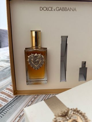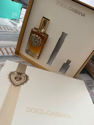 Perfume original Dolce & Gabbana Devotion. - Fragancia con notas cálidas y doradas. - Diseño de frasco icónico con corazón. - Tapa dorada brillante. Como se puede apreciar solo se han utilizado las miniaturas de viaje, el perfume no esta ni si quiera sacado del cofre. Fue un regalo pero no terminade gustarme, por eso lo vendo.
