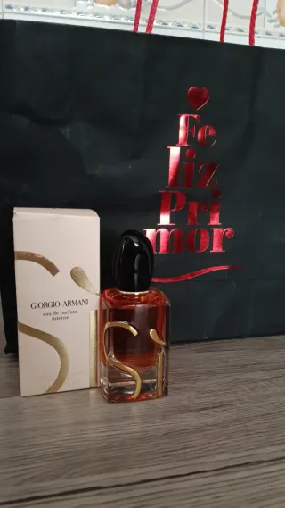 Perfume Si Intense de Giorgio Armani. - Fragancia Eau de Parfum. - Diseño elegante con detalles dorados. Lo vendo porque se lo he regalado equivocado a mi hija quería el normal y este es INTENSE , ella solo le quitó el plástico que lo envuelve y solo por eso no me hace PRIMOR la devolución. Su precio es de 56.64 euros.