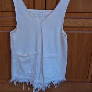 Peto vaquero blanco de Pull&Bear, talla XS. Está sin estrenar. - Diseño de peto. - Detalle de flecos en el bajo. - Bolsillos funcionales.