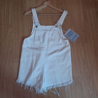 Peto vaquero de color blanco, con un diseño moderno y juvenil. - Tirantes ajustables. - Bolsillos frontales. - Bajo deshilachado.