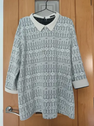 Camisa con un estampado geométrico en tonos grises y blancos. Presenta un cuello Peter Pan y mangas tres cuartos. Talla-xxl Gris crudo 55%algodón 50%poliester 5% elastan Fabricado en España