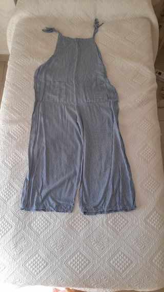 Precioso mono corto a rayas en tonos azules y blancos. Ideal para un look fresco y veraniego. - Diseño de peto con tirantes. - Bolsillos laterales. - Tejido ligero y cómodo. - Perfecto estado.