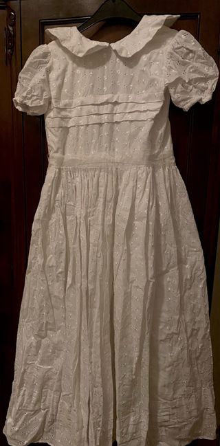 Traje de comunión clásico con un delicado encaje bordado. - Diseño elegante en blanco. - Cuello Peter Pan. - Mangas cortas abullonadas. - Falda larga con pliegues y detalles bordados.