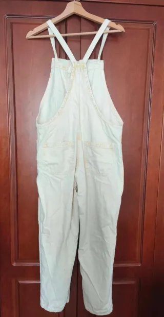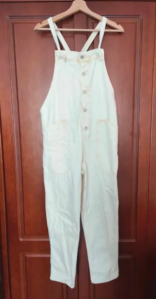 Peto denim en color blanco roto, de corte recto y estilo casual. Tiene tirantes ajustables con hebillas metálicas, bolsillo frontal grande y botones laterales para facilitar el ajuste. Tela resistente pero cómoda. En muy buen estado, sin manchas ni desgastes.