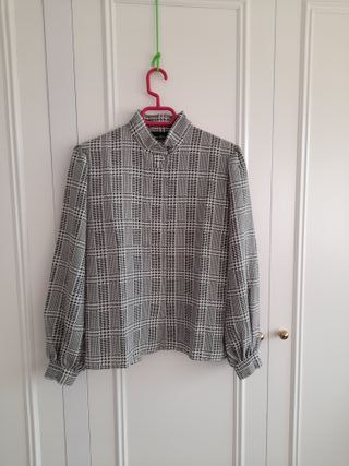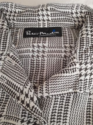 Vendo blusa de vestir Peter Martin de poliéster con estampado de pata de gallo blanco y negro, cierre con botones ocultos, de corte ligero y fluido, manga larga fruncida.Talla 42, medidas: largo 63cm, ancho espalda 44cm, largo manga 64cm. En perfecto estado.
