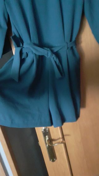 Mono corto de la marca Pimkie en color verde azulado. Tiene un cinturón para anudar a la cintura y bolsillos laterales. - Manga corta. - Diseño con escote redondo en la espalda. - Cinturón a juego. talla 42