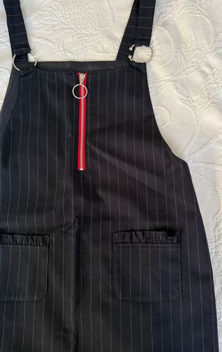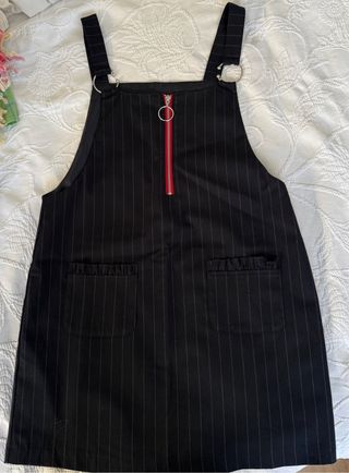 Vestido tipo peto con un diseño de raya diplomática. - Cremallera frontal roja con tirador de aro. - Dos bolsillos delanteros con detalle de volantes. - Tirantes con anillas metálicas.