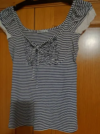 Camiseta de rayas con un diseño coqueto y juvenil. - Escote con volantes y lazada. - Mangas cortas con detalle de puntilla. - Tejido de algodón cómodo y transpirable.