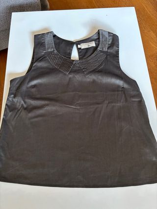 Elegante top sin mangas de la marca Cotélac. Presenta un diseño con cuello Peter Pan y un detalle de pliegues en el cuello y los hombros. - Tejido satinado. - Cierre de lágrima en la espalda.