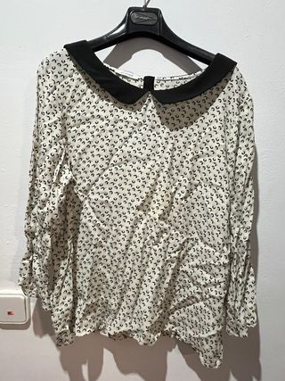 Elegante blusa blanca de Zara con un delicado cuello Peter Pan. - Cuello con detalle de encaje negro. - Mangas largas abullonadas con puño fruncido. - Tejido ligero y vaporoso.