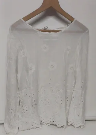 Blusa de algodón con detalles bordados y calados. Afamada marca Bato Peto talla L - Diseño con manga larga. - Adornos florales. - Bajo con puntilla y calados. - Cierre en la espalda con lazada. medidas: Espalda 38/40, contorno de pecho hasta 100, largo 65, nueva sin 🏷️🌸🌸🌸