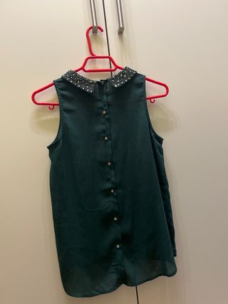 Elegante camiseta de fiesta en color verde, perfecta para ocasiones especiales. Destaca por su diseño y detalles. - Cuello Peter Pan adornado con pedrería y perlas. - Diseño sin mangas. - Capas superpuestas en el bajo para un efecto moderno. - Espalda con botones que se atan.