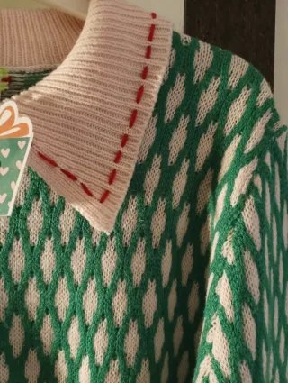 Jersey de punto muy cálido y amoroso,con cuello y puños en contraste, mangas tipo farol. Estilo boho chic. Queda puesto muy bonito. Amplio en el bajo no se ajusta. MEDIDAS 60*60 ESTILO OVERSIDE. - Diseño de rombos. - Cuello Peter Pan. - Manga larga abullonada.