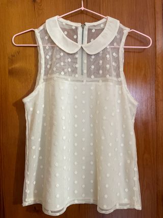 Elegante blusa sin mangas con un llamativo cuello Peter Pan. - Diseño de doble capa. - Cierre de botón en la parte trasera del cuello.