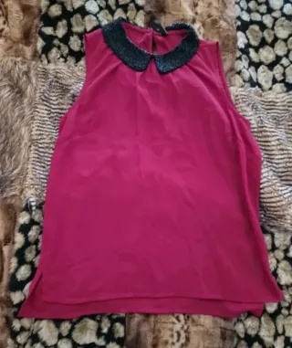 Blusa sin mangas con un diseño elegante y moderno. - Cuello Peter Pan con detalles brillantes. - Corte holgado y cómodo. - Aberturas laterales en el bajo.