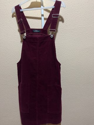 Vestido peto de pana en color burdeos de la marca Bershka. Un diseño cómodo y versátil. - Tejido de pana. - Tirantes ajustables con hebillas metálicas. - Dos bolsillos frontales. - Puesto 2 veces, en muy buen estado.