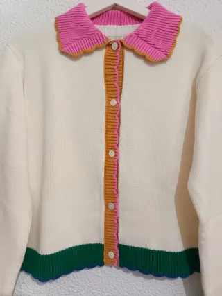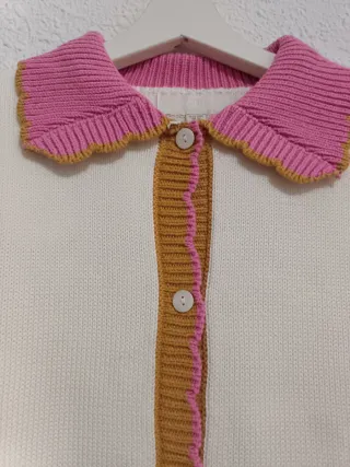 Cardigan de punto con un diseño colorido y juvenil. - Cuello Peter Pan con ribete festoneado en rosa y naranja. - Cierre de botones. - Puños y bajo con detalle de canalé. - Bajo con banda de punto en verde y azul.