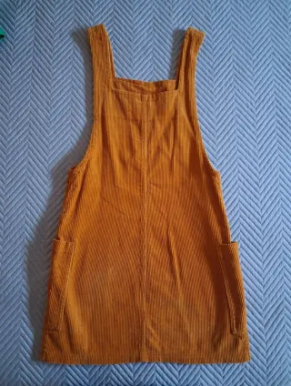 Vestido tipo peto de pana en color naranja. Muy poco uso, si necesitas medidas dime! - Dos bolsillos delanteros. - Cierre con botones en los tirantes.