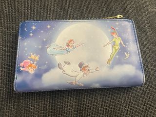 Monedero con un diseño encantador de Peter Pan y sus amigos volando bajo la luna. - Ilustración de Peter Pan, Wendy, los niños perdidos y Campanilla. - Fondo estrellado con una gran luna. - Cierre de cremallera.