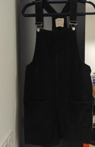 - Diseño de peto con tirantes. - Tejido de pana suave. - Bolsillo frontal. - Cierre lateral con botones.