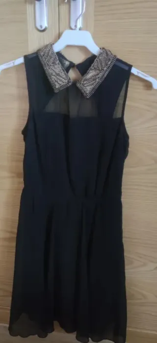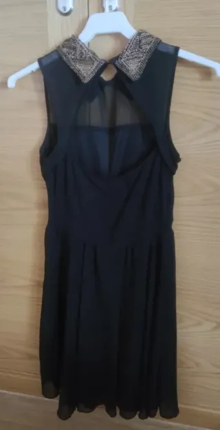 Elegante vestido negro sin mangas con un llamativo cuello adornado con bordados dorados. - Cuello estilo Peter Pan con detalles de pedrería y bordado. - Diseño sin mangas. - Tejido ligero y fluido.
