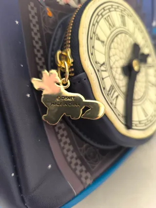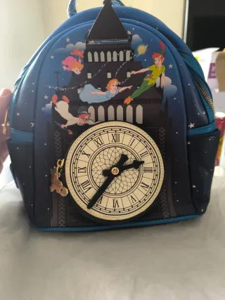 Mochila con diseño inspirado en Peter Pan y el Big Ben. Presenta una esfera de reloj en la parte frontal. - Personajes de Peter Pan volando. - Detalle de reloj con manecillas. - Estrellas y nubes en el fondo.
