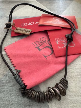Collar de la marca UNO de 50 con un diseño inspirado en Peter Pan. La cadena es de cuero negro y los colgantes son de metal plateado. - Cierre ajustable. - Detalle de cuentas metálicas. - Incluye etiqueta de la marca.