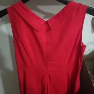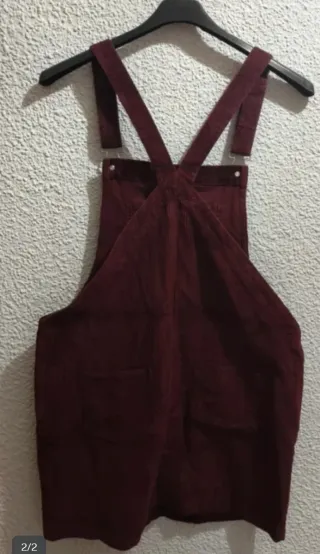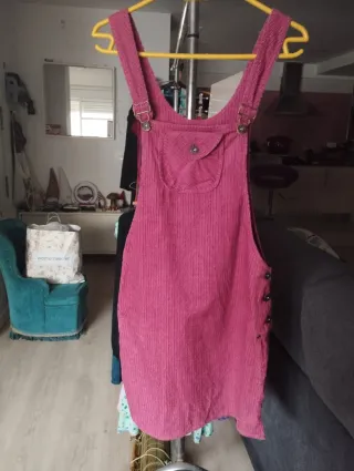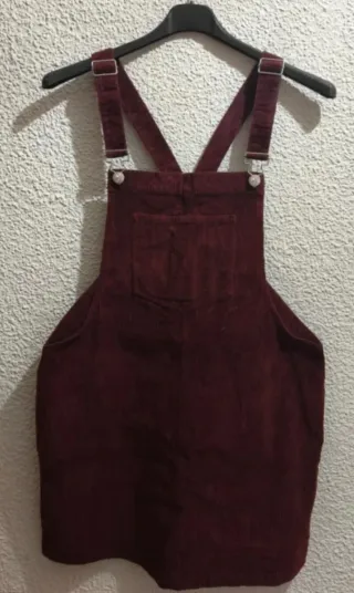 Vestido estilo peto de pana en color rojo. - Tirantes ajustables con hebillas. - Bolsillo en la parte delantera. - Dos bolsillos laterales. Precio : 6.99€ Se recoge en mano : -Madrid (a concretar día lugar y hora.)Por compras minimas. -Toledo unicamente en el Pueblo La Guardia. Hago envíos a través de Wallapop.
