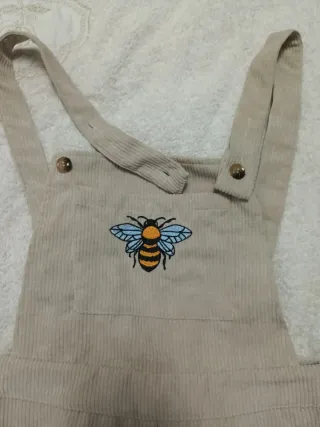 Peto corto de pana con un bordado de abeja en la parte delantera. - Diseño de tirantes. - Bolsillo en la parte frontal. - Tejido de pana con canalé.