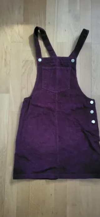 Vestido tipo peto confeccionado en pana. Tiene un diseño de tirantes y dos bolsillos frontales (decoración, no funcionales) - Material: Pana. - Color: Morado. - Diseño: Vestido peto con tirantes y bolsillos.