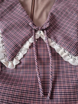 Vestido de corte romántico con estampado de cuadros. - Cuello Peter Pan con encaje. - Mangas abullonadas. - Lazada en el escote.
