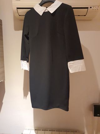 Elegante vestido negro con detalles blancos. - Diseño con cuello Peter Pan. - Puños blancos en las mangas.
