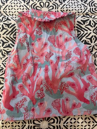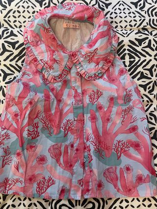 Blusa sin mangas con un estampado vibrante de corales y algas marinas en tonos rosas y azules. Cuello Peter Pan con volantes. - Diseño exclusivo de Kling. - Cierre de botones en la parte delantera. - Tejido ligero y fresco.
