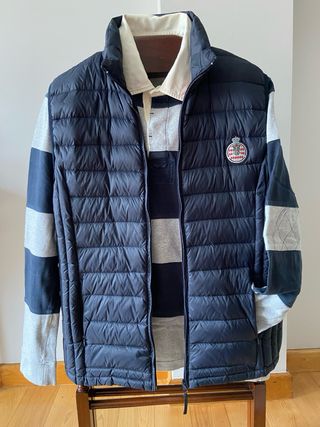 Chaleco acolchado con un diseño moderno y reversible. - Exterior en azul marino. - Interior en color naranja vibrante. - Cierre de cremallera frontal. - Bolsillos laterales con cremallera.
