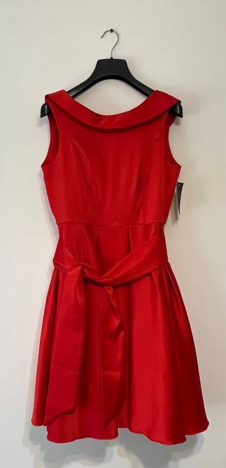 Elegante vestido rojo, ideal para eventos especiales. Presenta un diseño sin mangas y un favorecedor cinturón. - Cuello estilo Peter Pan. - Cinturón a juego. - Falda con vuelo.