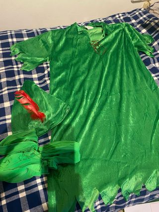 solo usado una vez Disfraz de Peter Pan para adulto. El conjunto incluye el vestido , las medias y el sombrero. - Vestido de manga corta con cordones en el escote. - Sombrero con pluma roja. - Tela suave y brillante. no incluye cuchillo