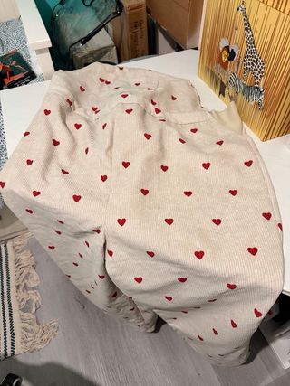 Conjunto de ropa premamá que incluye un peto y dos pantalones. - Peto con estampado de corazones rojos y talla L. - Tejido de canalé. - Pantalones acampanados vaqueros. Talla M.