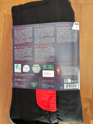 Pantalón de trabajo anticorte con detalles de alta visibilidad. - Color principal verde oscuro. - Inserciones de color rojo en la parte inferior de las perneras. - Tirantes ajustables.tiene un pequeño agujero al lado del bolsillo