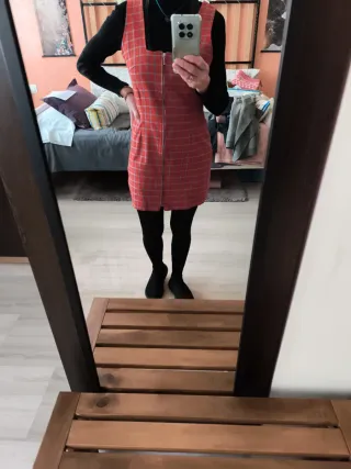 Vestido estilo peto de pana en color rojo. - Tirantes ajustables con hebillas. - Bolsillo en la parte delantera. - Dos bolsillos laterales. Precio : 6.99€ Se recoge en mano : -Madrid (a concretar día lugar y hora.)Por compras minimas. -Toledo unicamente en el Pueblo La Guardia. Hago envíos a través de Wallapop.