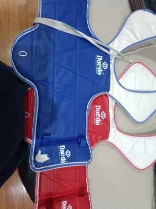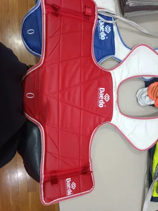 Peto de Taekwondo y espinilleras Daedo en buen estado, usado solo dos veces. - Diseño acolchado para protección. - Cierre ajustable con tiras. - Ribete blanco y azul/Rojo. Precio negociable. Se puede vender por separado.