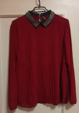 Elegante blusa de manga larga en tono rojo burdeos. Presenta un cuello Peter Pan adornado con detalles brillantes. - Cuello Peter Pan con pedrería. - Manga larga. - Tejido ligero transparente en mangas y espalda Medidas 40 cm de hombro a hombro 65 cm largo