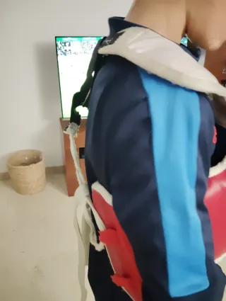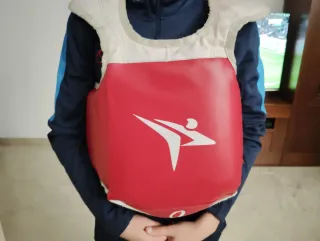Peto taekwondo niños desde 6 a 10 años aprox hasta 1.35cm altura Esta como nuevo solo tiene dos pequeñas rozaduras que aparecen en la foto de llevarlo en la mochila y es en la parte azul con lo cual si se usa por la parte roja esta perfecto