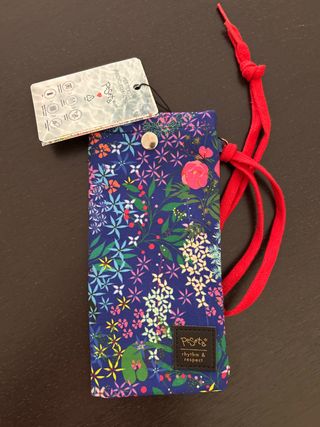 Funda para gafas con un bonito estampado floral multicolor sobre fondo azul. Hecho de material reciclado PET. Incluye etiqueta. - Cierre de botón a presión. - Correa roja. - Fabricada con PET reciclado. Medidas: 10x20 cm
