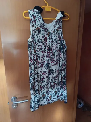 Vestido de Stradivarius con estampado floral sobre fondo blanco. Presenta un cuello Peter Pan con detalle de lazo. - Diseño sin mangas. - Cuello con contraste negro. - Estampado de flores en tonos burdeos y verde.