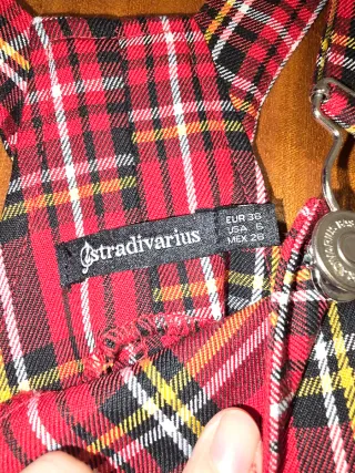 Peto de tela con estampado de cuadros escoceses en tonos rojos y amarillos. Tiene un bolsillo en la parte delantera. - Diseño de cuadros. - Bolsillo frontal.