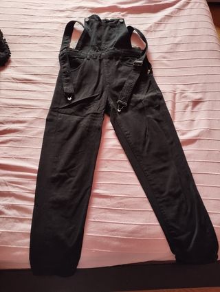 Peto vaquero de color negro, ideal para un estilo casual. Da muy poca talla, aunque ponga M es como si fuera una S. - Tirantes ajustables con clips. - Bolsillos delanteros y traseros.