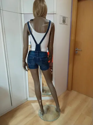 Peto vaquero corto para mujer, con un diseño moderno y desgastado. - Tirantes ajustables con hebillas. - Bolsillo en la parte delantera. - Aberturas desgastadas en los bajos. - Cierre lateral con botones. Cómo nuevo