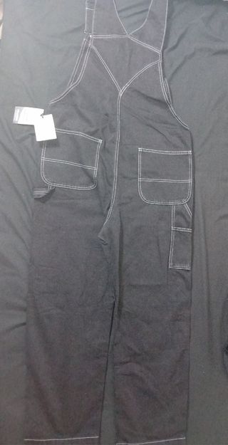 Pantalón vaquero unisex de la marca Pull & Bear, color negro. - Diseño clásico de peto. - Costuras en blanco. - Bolsillos funcionales.