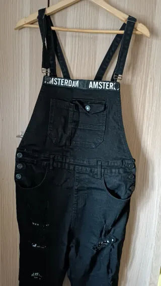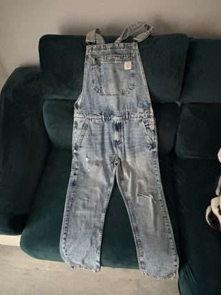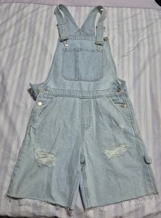 -Talla M (40/42) - Diseño denim. - Corte corto. - Efecto desflecado en el bajo. -Color azul medio. -Tirantes ajustables y detalles desgastados estilo desgarrado. -Bolsillos delanteros y traseros funcionales. -Cremallera lateral para mayor comodidad cuando te lo pones en la zona de la cadera. -Usado en buen estado, sin manchas ni roturas más allá del diseño original. -Ancho de pierna (boca del pantalón): 34 cm - Tiro (desde entrepierna hasta cintura): 51 cm - Ancho de cadera (de lado a lado): 47 cm - Largo del torso (desde hombro hasta entrepierna): 58 cm -Largo total (desde tirantes hasta el bajo de la pierna): 80cm